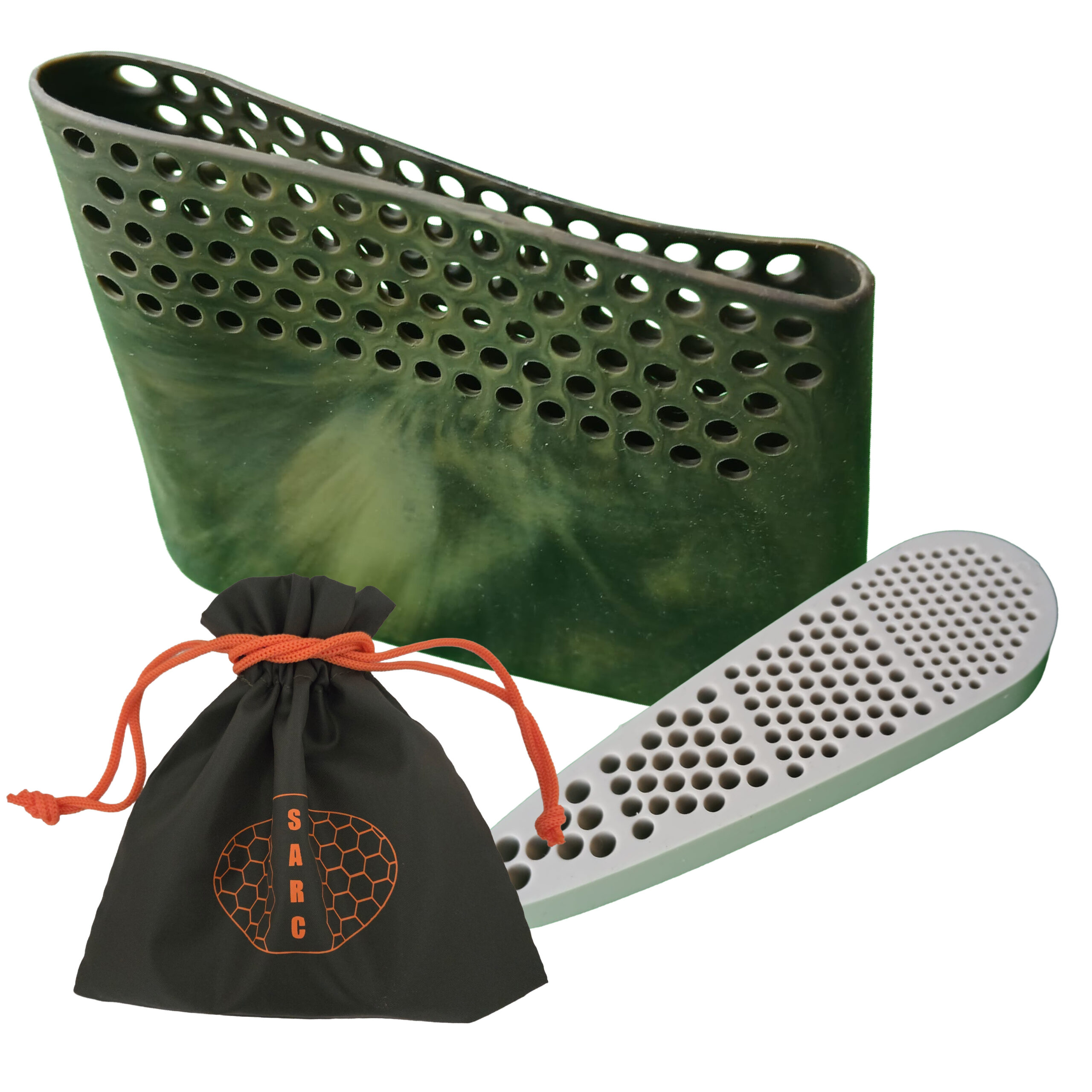Le principe est simple : la structure alvéolée absorbe et répartit l’énergie dû au tir, tandis que la chaussette en silicone enveloppe la crosse pour offrir un meilleur grip et une protection efficace.