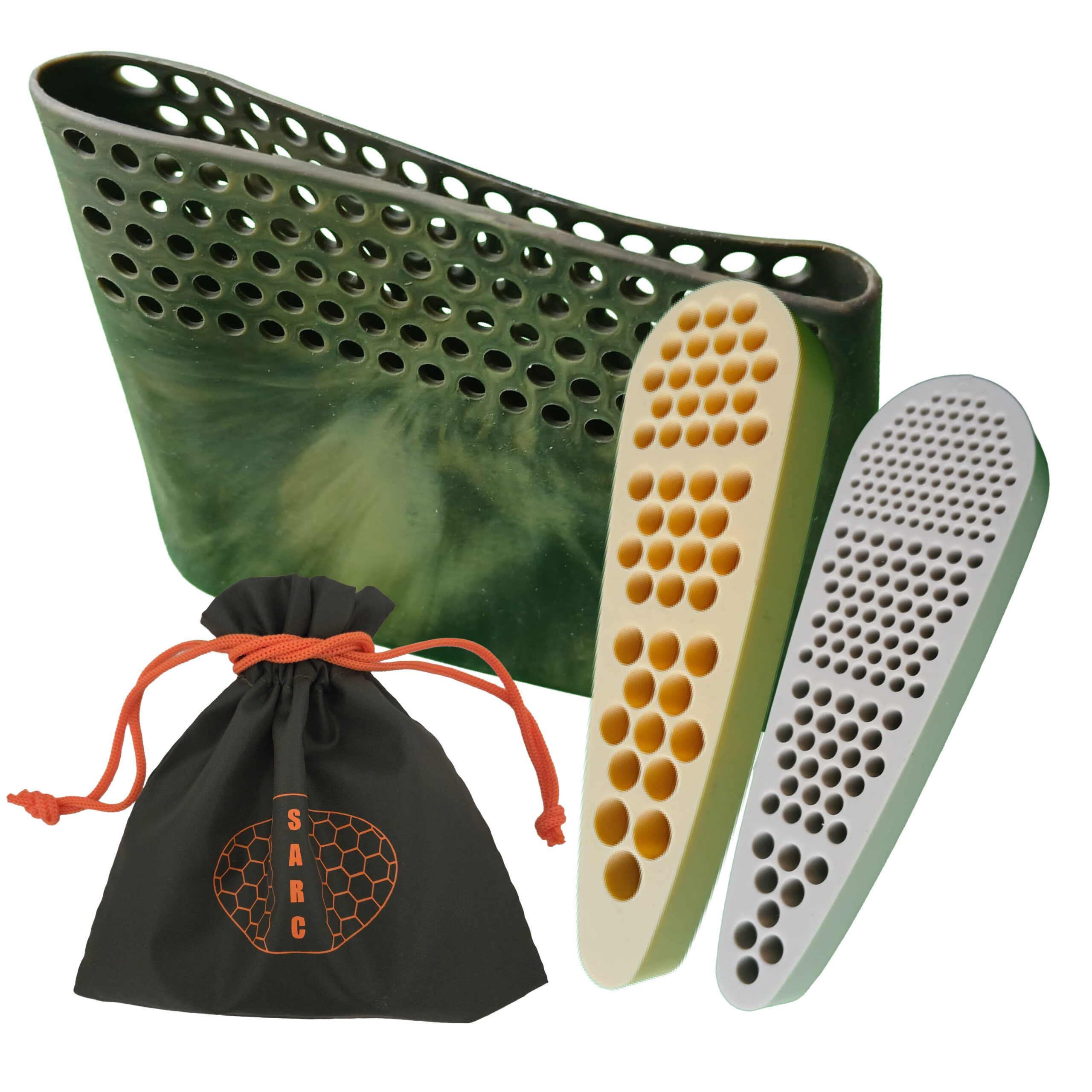 Le principe est simple : la structure alvéolée absorbe et répartit l’énergie dû au tir, tandis que la chaussette en silicone enveloppe la crosse pour offrir un meilleur grip et une protection efficace.